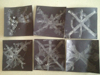 We disolved salt in hot water, then the kids used the solution to paint a snowflake on black paper.