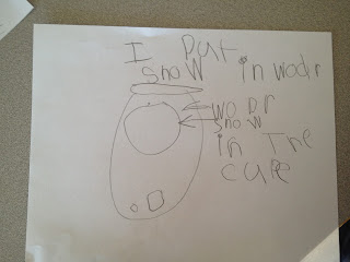 One of the things the kids wondered about snow was: What would happen if they put snow in water? We had one small problem. All of the snow outside had melted! When I pointed this out, they told me what I always tell them. We can solve problems! So... I brought in my snow cone machine to make our own! Some predicted that it would turn to ice and others predicted that it would melt. The kids each took a spoonful of "snow" and dropped it into their own cup of water. They observed what happened and recorded the results. The snow melted! We discussed why. They came to the conclusion that the water was warmer so the snow melted and turned to water! Smart Cookies!! This was an easy and fun experiment to do with the kids and gave them more practice for documenting results.