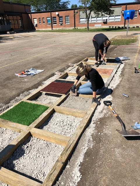 We had an area that we were having some problems with in the middle of our asphalt area.  We wanted to turn it into something all of the kids could explore and benefit from and decided to create a Barefoot Sensory Path. We came up with a design and my husband figured out how to make it so that it would be sturdy and last. Our amazing PTO gave us funds to purchase the materials and we had fun shopping at Lowes for items that would provide the sensory experiences we were hoping for.