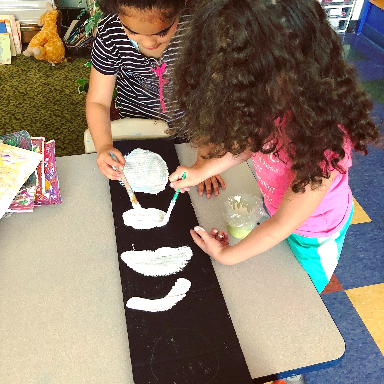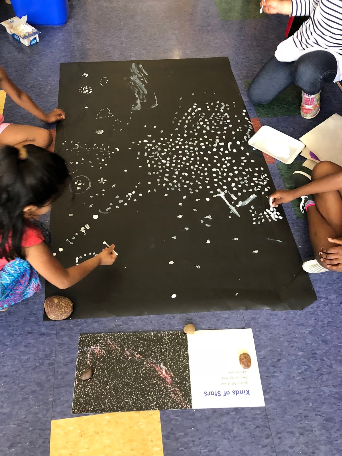We read many books about clouds, both informational and fictional. They learned that there are three main kinds of clouds. They showed their learning by creating a mural of the daytime sky. Here are some working on the different kinds of clouds.