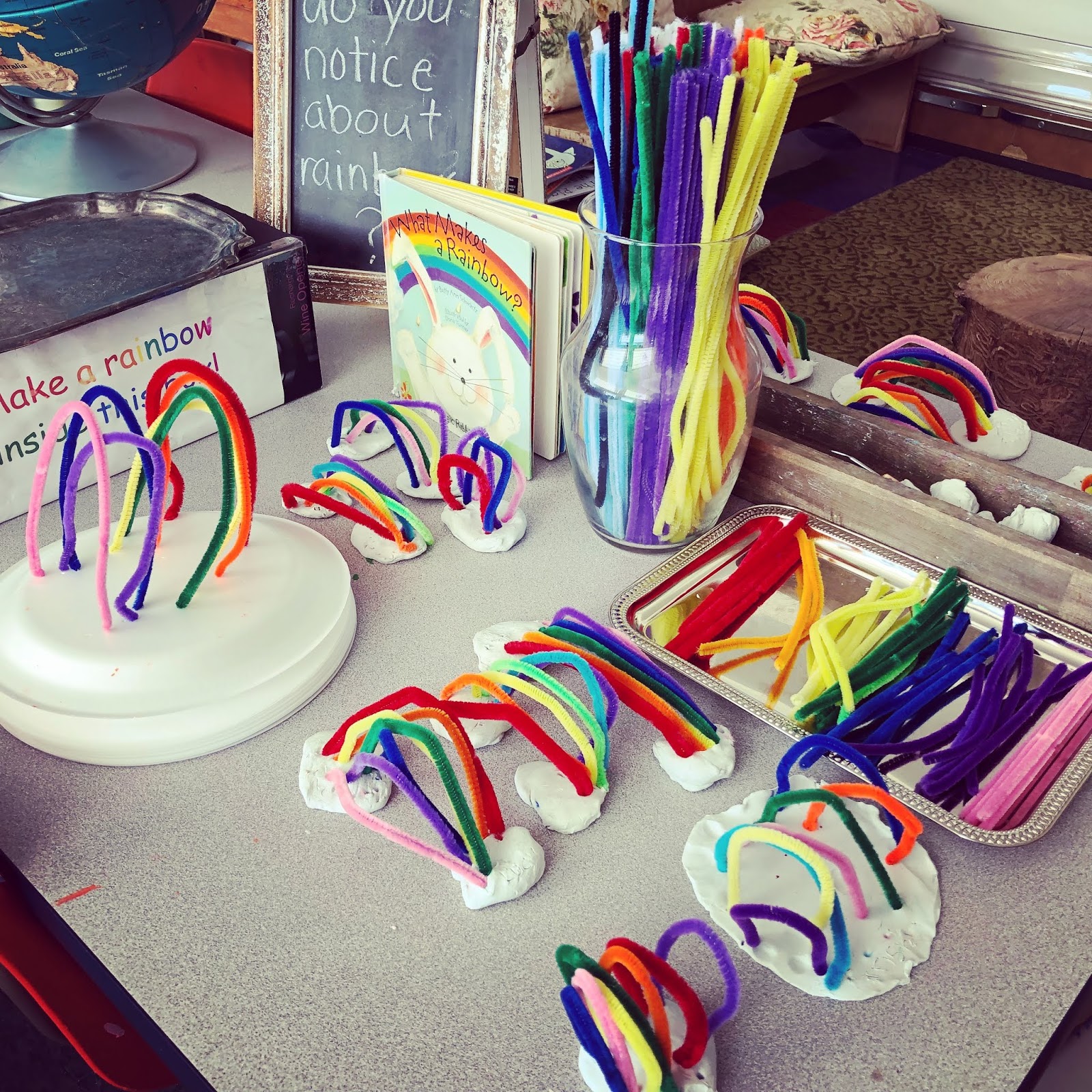 I started out with rainbows and sky colors. I found that most of them already knew the order of the colors and how rainbows are made. They loved creating rainbows though so I set out an area for them to create with art materials and prisms with flashlights.