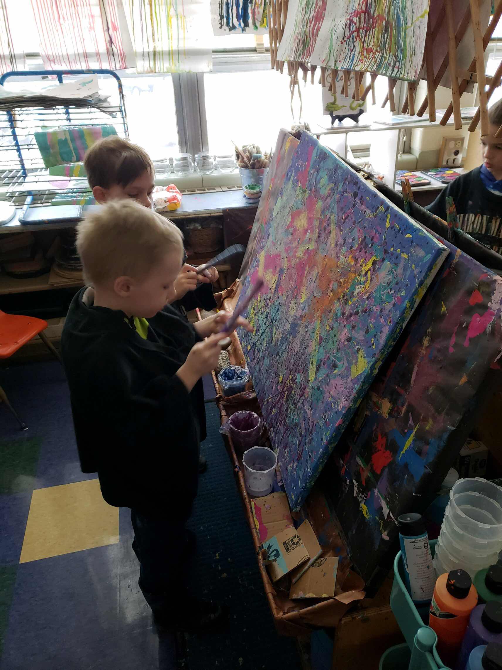 We also explored by using force and motion to create a collaborative piece of art. First they pushed and pulled large brushes to mix the colors for the base.