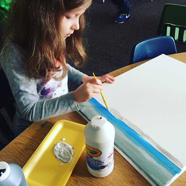 Each day, one of the kids gets to look at the sky and mix paint to try to match it. They then paint a stripe on our canvas to show the color of the sky that day.  This art piece will be titled "April Sky."  At the end of the month, we will use it to figure out which color the sky was the most during the month of April. This is a perfect mix of art, science and math.