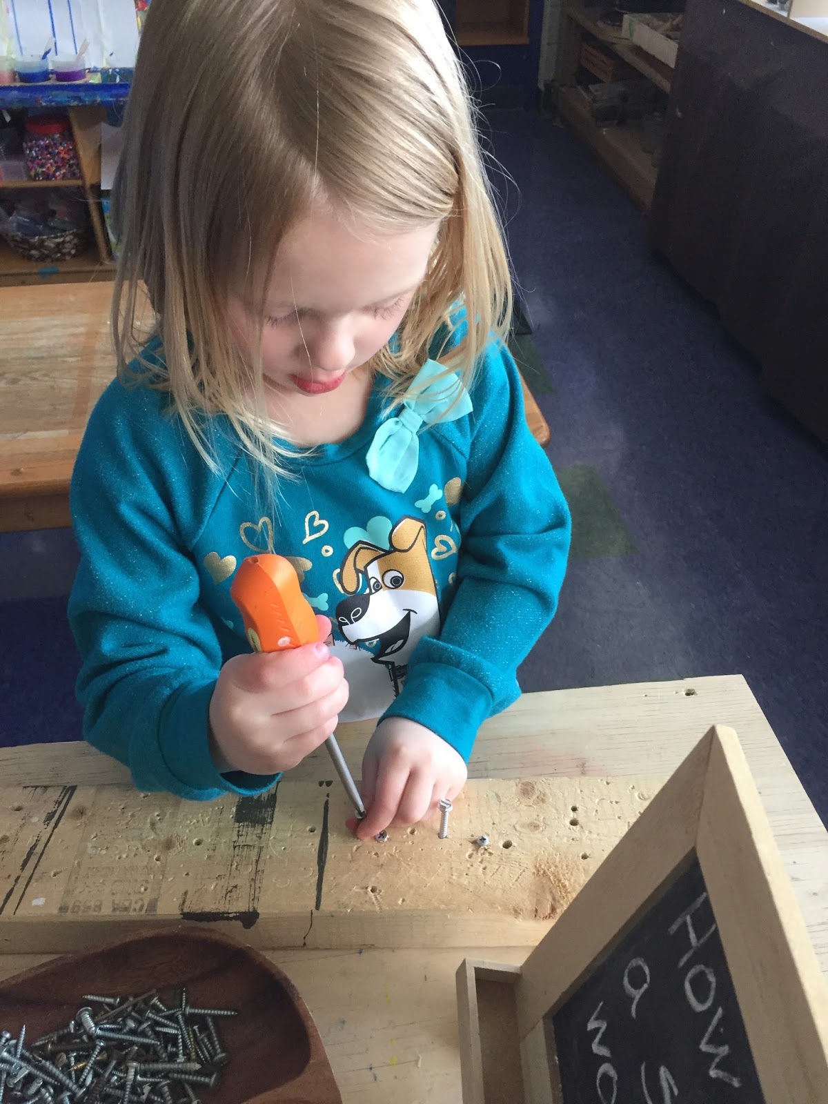 It was not easy getting those screws into the wood!  They were really building up some much needed fine motor muscles!