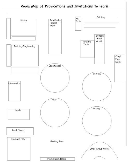When I use these, I still need to plan my environment as the third teacher so I made a map of my room using Pages on my iPad. This is great to have for substitute teachers so they know what is going on during the play block! I just fill in the invitations to learn, provocations, challenges, and experiences that will be set up in each area.