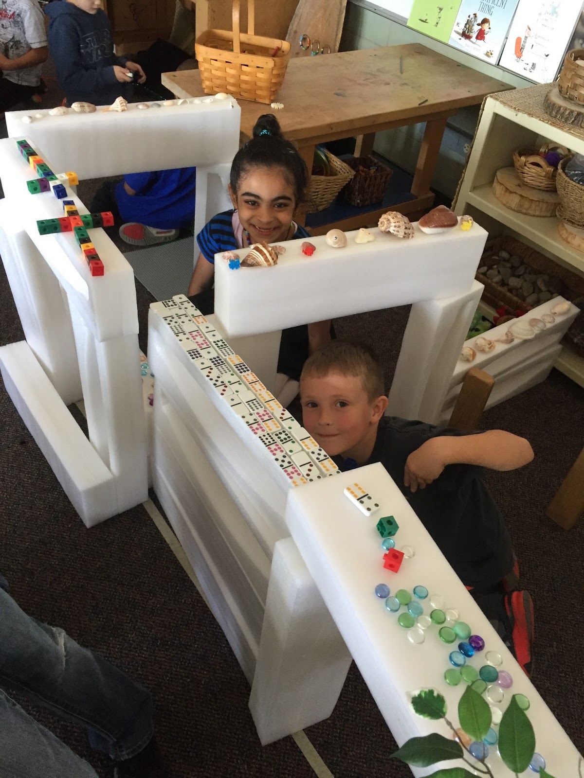 Next is our math area.  I have a table with materials to explore a certain concept, and shelves with math manipulatives and materials for them to explore specific math concepts.  The difference between these and Math Centers/Stations is that I do not tell the kids what to do with the materials.  Once they know what math is, they explore these materials as mathematicians and see what they notice or discover about math.  They share with the class what they noticed or discovered and this act of sharing usually turns into a mini-lesson on the concept.